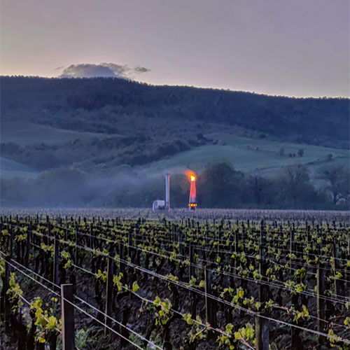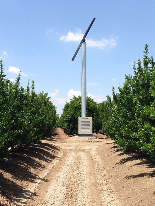 Ветрогенераторы затягивают более теплые слои воздуха сверху, чтобы рассеять холодный воздух в саду и защитить плодовые деревья от повреждений, вызванных заморозками.
